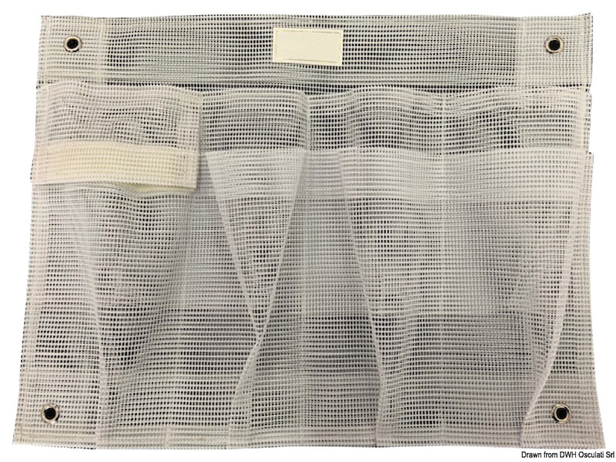 In robusta tela da vela bianca, adatta per stivare cime, maniglie winch, oggetti personali ecc. Completa di occhielli per il fissaggio a parete ed elastico superiore.