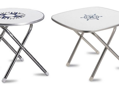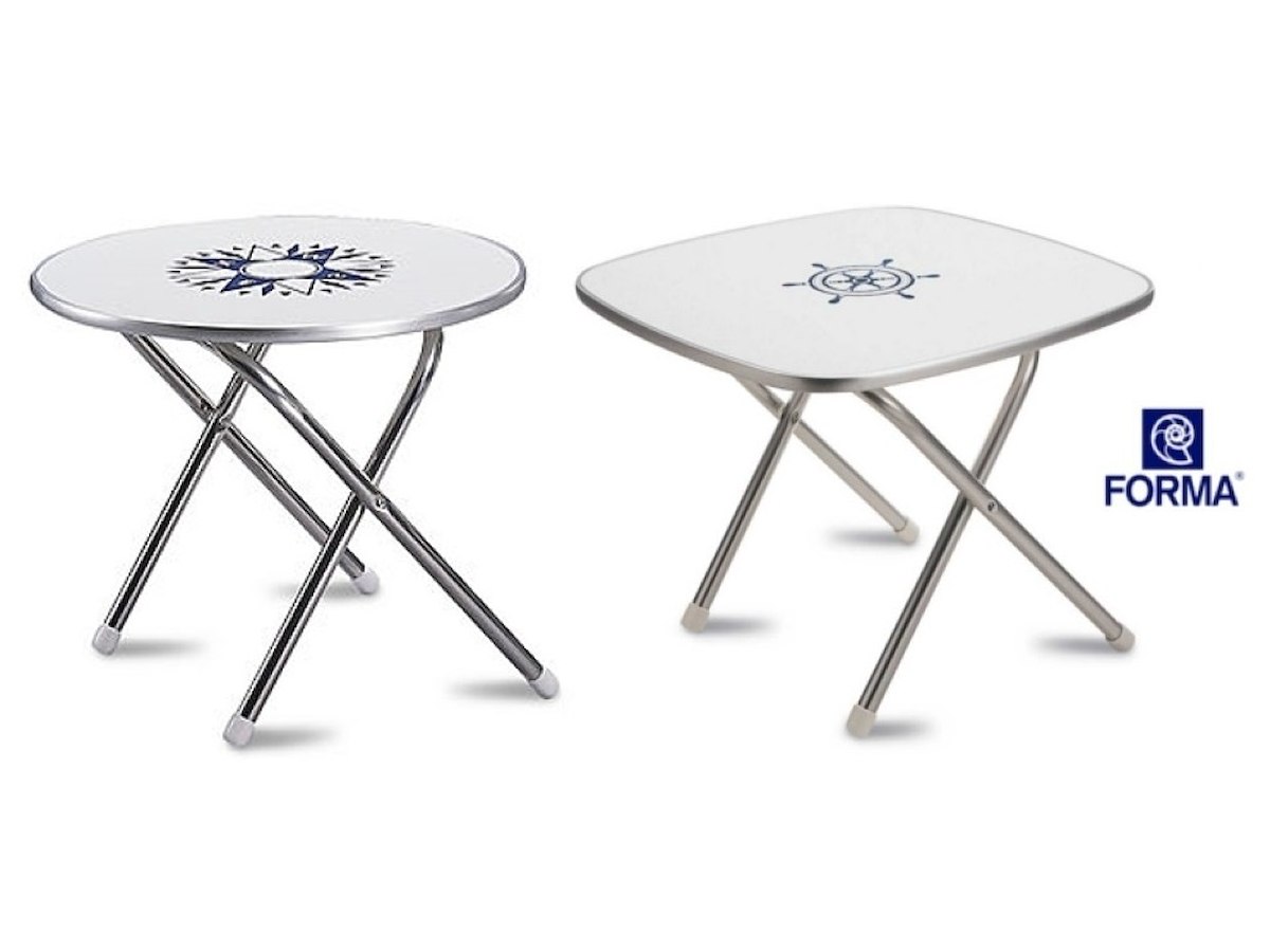 tavoli con piano in melamina laminata bianca resistente all'acqua e all'umidità, con decoro in stile marino, gambe in alluminio anodizzato Ø25mm, altezza 49cm