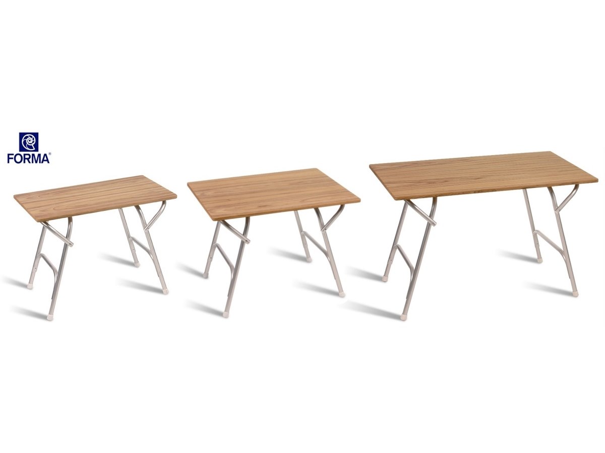 tavoli con piano in teak e gambe in alluminio anodizzato Ø25mm, la misura più grande permette di regolare l'altezza del piano su due posizione fisse (73 oppure 56cm)
