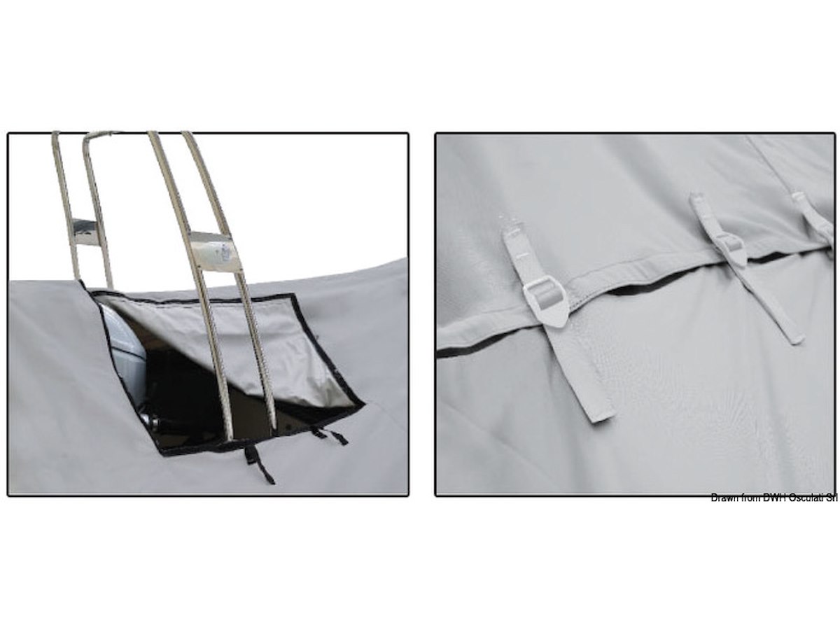 Completo di apertura per un eventuale Roll bar. Tessuto ATLAS da 280 g/m 2 impermeabile, traspirante ed UV resistente. Può essere usato per traino su carrello stradale. Fissaggio con fettucce resistenti. Dotato di due Cam Cleat per tendere il telone con semplicità.