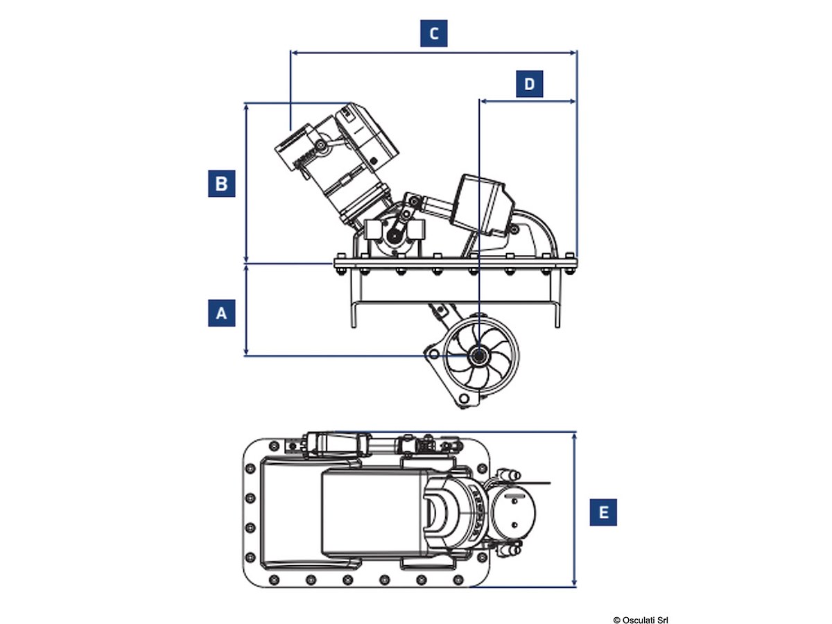 Il sistema brevettato a “perno ribassato” minimizza le richieste di spazio interno ma permette la massima esposizione in acqua dell’elica.