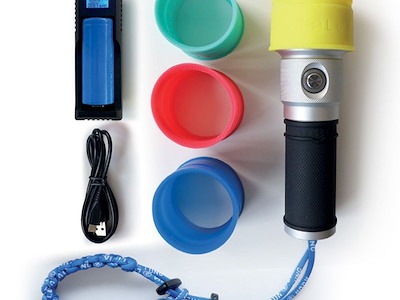pack torcia ricaricabile aqualung SEAFLARE completa di 4 anelli deflettori di luce in silicone colorati, peso 224 gr, dimensioni Ø 49/35 mm lunghezza 150mm