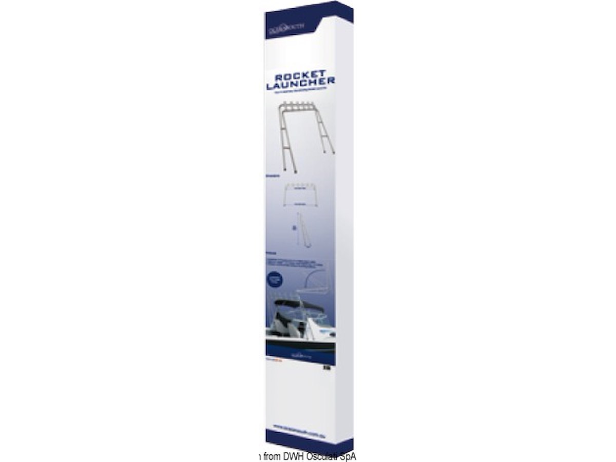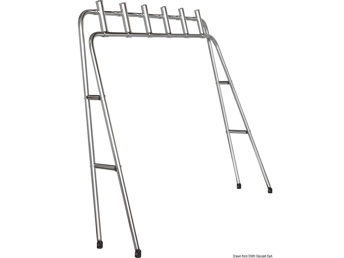 Fabbricata in alluminio anodizzato, con tubi Ø 32 mm. Completa di 6 portacanne e di tutti gli accessori per il montaggio. Se inutilizzata la torre può essere ripiegata sul trincarino.