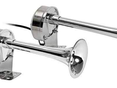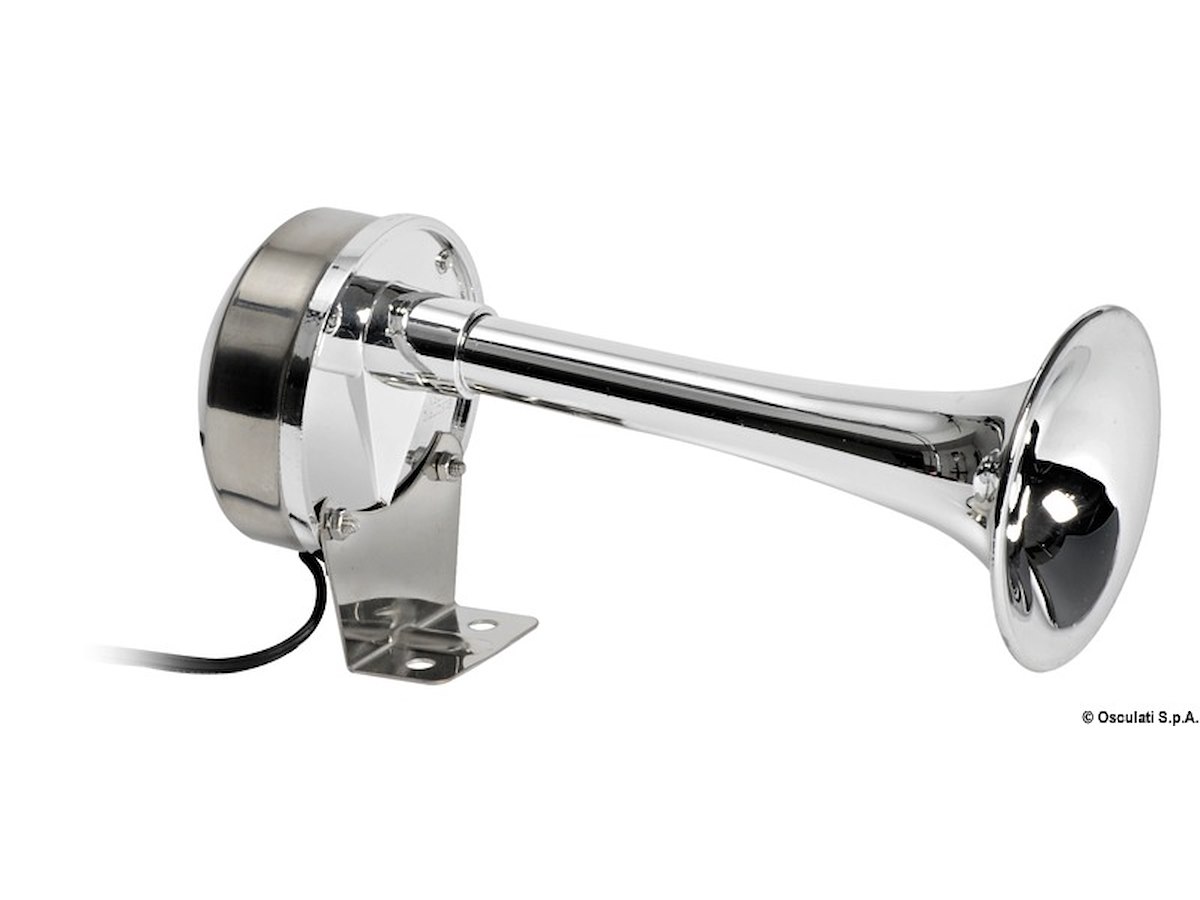 Corpo in acciaio inox lucidato a specchio e corno in ABS cromato. Suono singolo o bitonale.