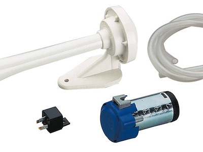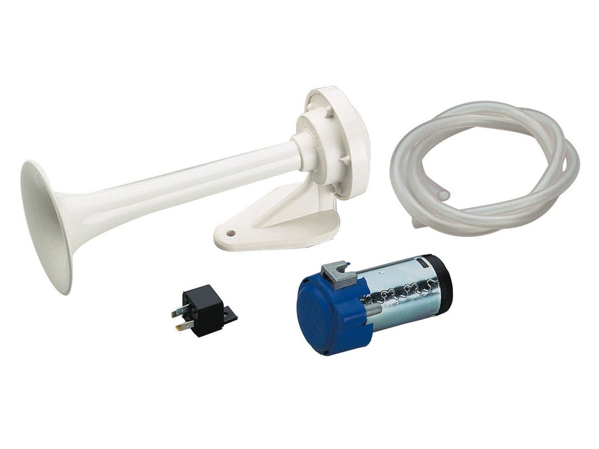 tromba elettropneumatica di elevata potenza e dimensioni ridotte, fornita comleta di compressore elettrico e accessori di montaggio, cornetto verniciato bianco, lunghezza 250 mm