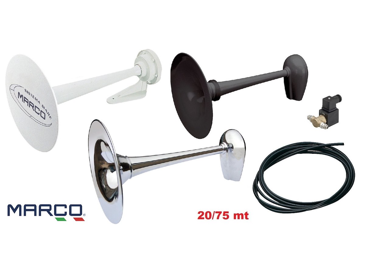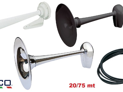 avvisatore sonoro omologato con tromba Ø300mm, lunghezza 460mm, completo di valvola elettrica e accessori di montaggio. Disponibile in versione verniciata bianca o cromata