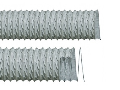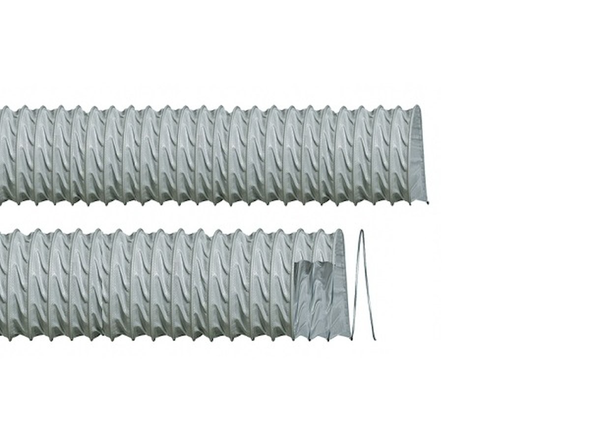 tubo flessibile realizzato in tessuto di poliestere spalmato in PVC autoestinguente, spessore 120 micron, spirale di rinforzo incorporata tra i due strati, comprimibilità assiale 8a1, ideale per aerazione vano motore, venduto a rotoli, prezzi al metro