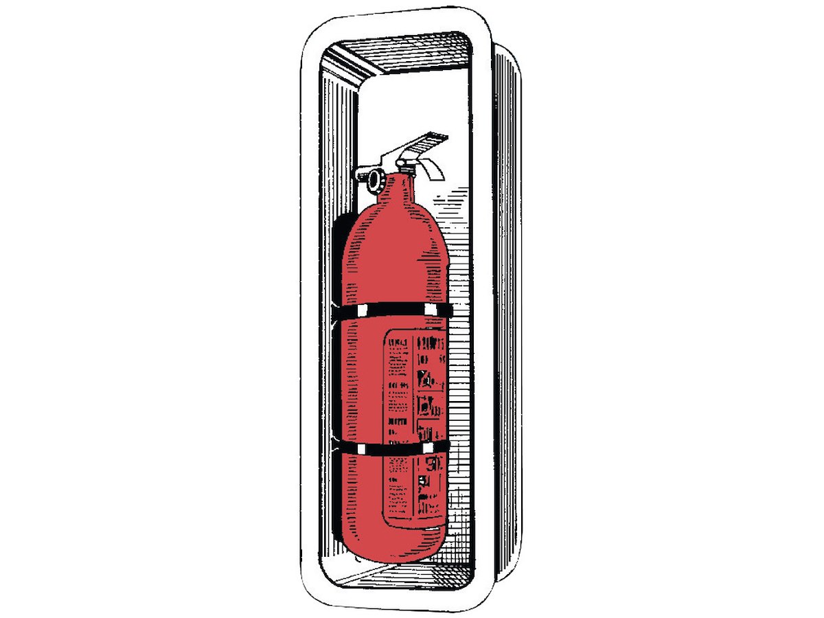 Predisposto per tutti gli estintori da1 kg, é completo di elastico di fermo. Materiale: ABS bianco Vano mm: 85x340 Profondità mm: 80 Cornice esterna mm: 150x410