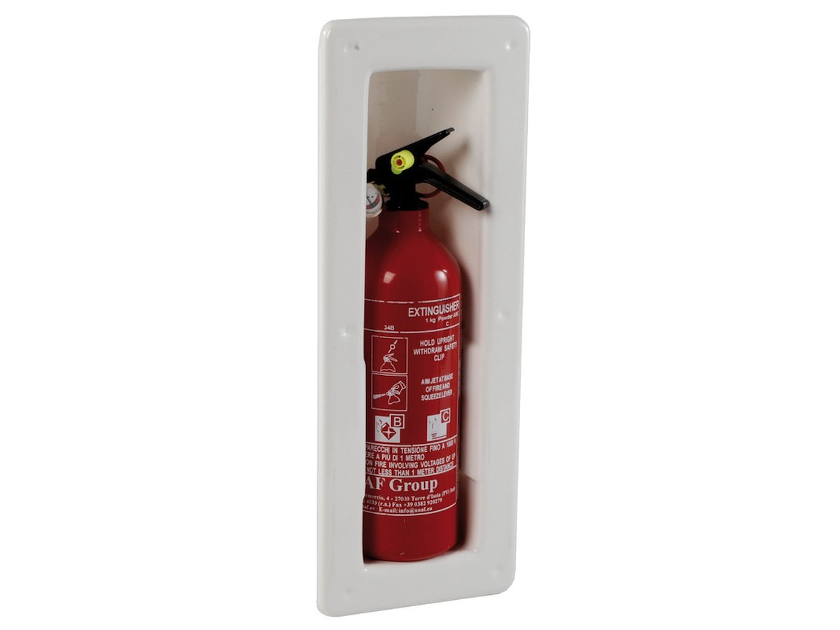 Progettato per gli estintori ANAF da 1 kg che si inseriscono nel vano a pressione, senza necessità di alcun tipo di aggancio.