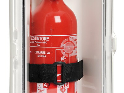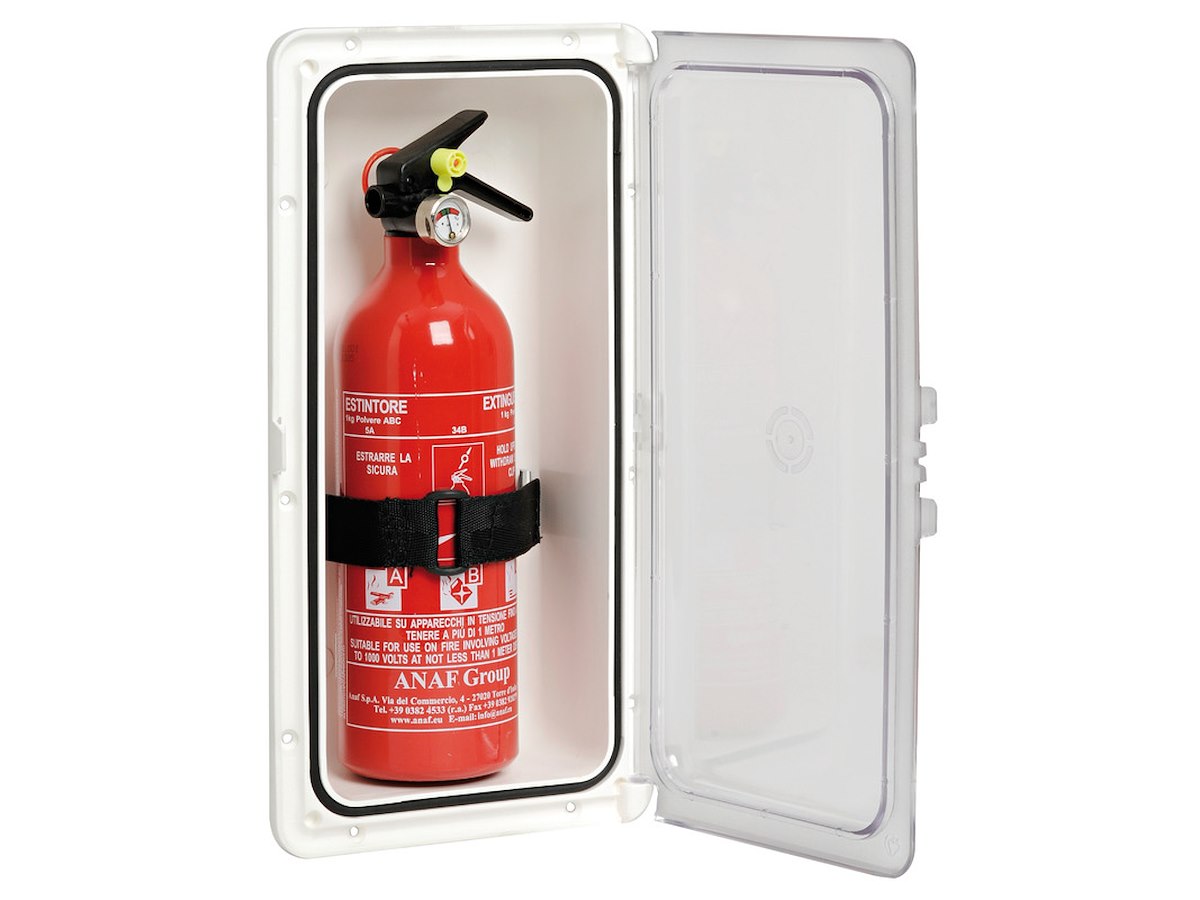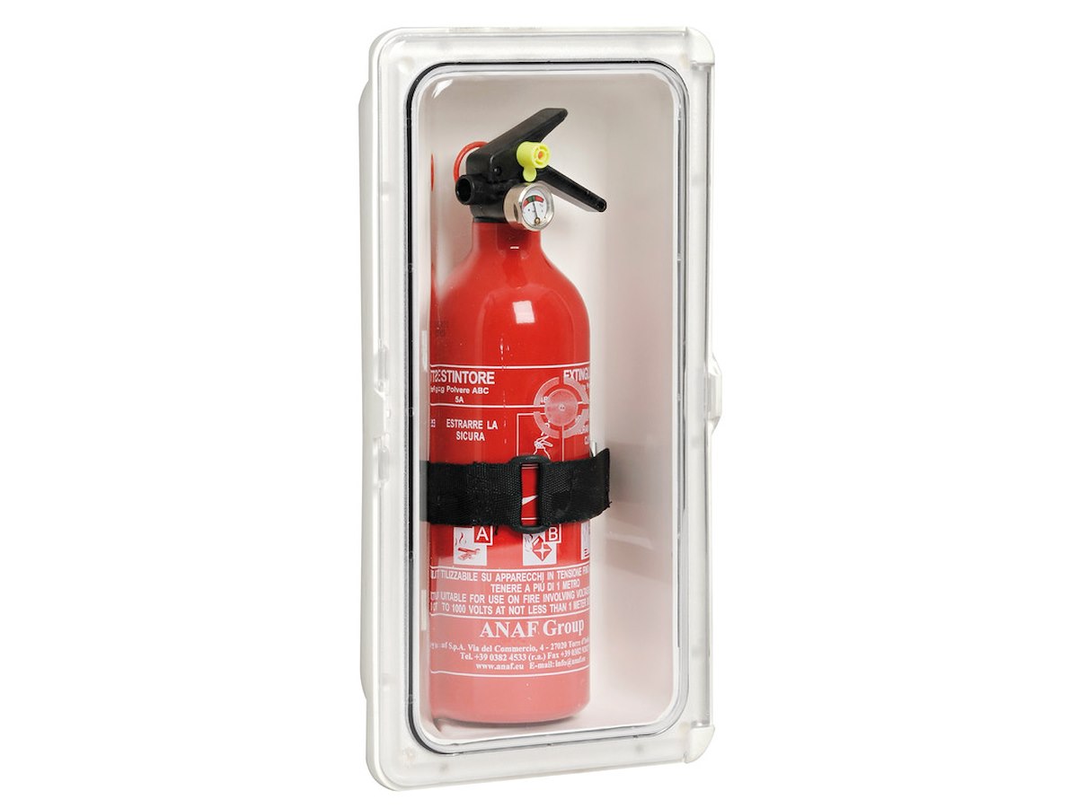 In polipropilene bianco con portello in policarbonato resistente UV trasparente e chiusura a scatto per estintori ANAF da 1 kg. Tenuta stagna, ottime finiture, colore bianco. Fornito con appositi supporti e nastro autobloccante apribile per un ottimo fissaggio dell’estintore.
