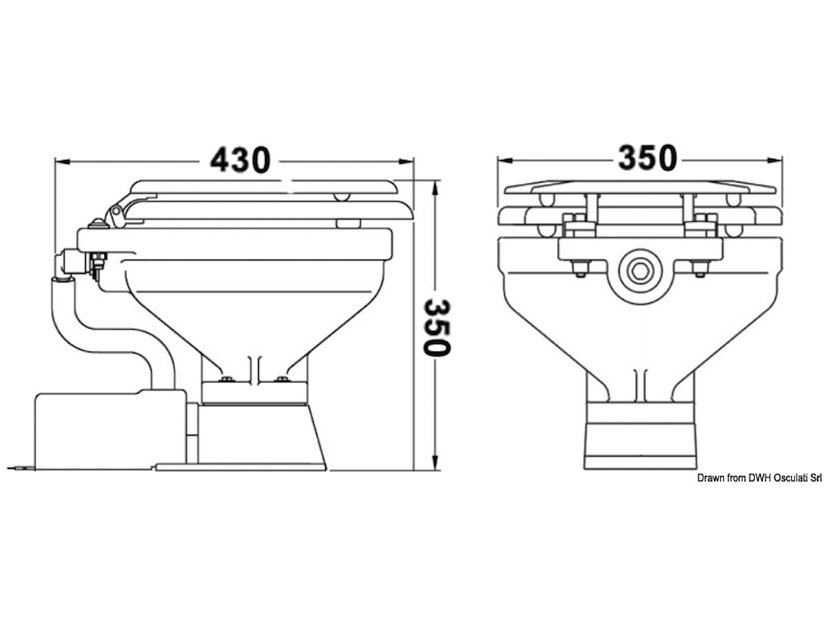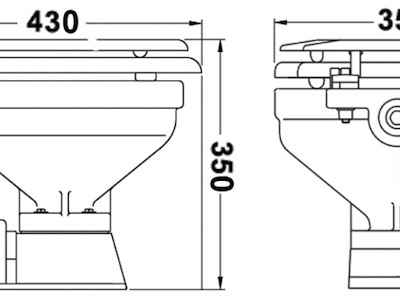 Tazza in ceramica bianca, tavoletta in legno. Interruttore azionamento incluso. Portagomma entrata 19 mm, uscita 25 mm. Pompa maceratrice autoadescante fino 1,2 m. Può essere montato fino a 90 cm sotto la linea di galleggiamento.